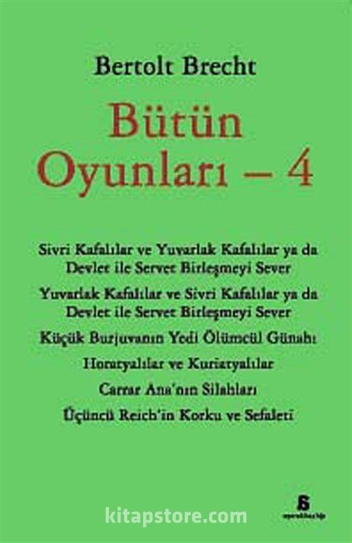 10 cilt halinde yayınlanacak olan Bertolt Brecht'in Bütün Oyunları 4. cildinde yayınlacak oyunları, Sivri Kafalılar ve Yuvarlak Kafalılar ya da Devlet ile Servet Birleşmeyi Sever, Yuvarlak Kafalılar ve Sivri Kafalılar ya da Devlet ile Servet Birleşmeyi Sever, Küçük Burjuvanın Yedi Ölümcül Günahı, Horatyalılar ve Kuriatyalılar, Carrar Ana'nın Silahları, Üçüncü Reich'in Korku ve Sefaleti