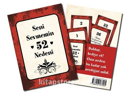 Onu sevmenizin 52 nedenini bulun, kartları kendi el yazınızla doldurun ve ona kendisini çok özel hissetmesini sağlayacak hiç unutamayacağı bir hediye verin! Kişiye özel, sevgi dolu bu hediye ile sevdiğinizi mutlu edin.