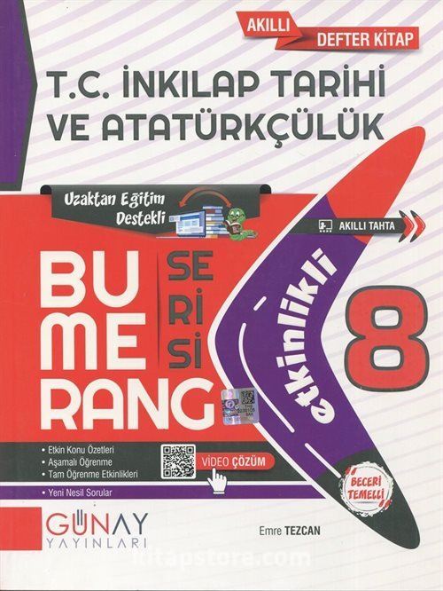 "Bumerang Serisi" içinde yer alan "8. Sınıf Etkinlikli T.C. İnkılap Tarihi ve Atatürkçülük" kitabı hazırlanırken başarıya ulaşmada bilginin bumerang etkisinden yararlanıldı. Her bir kazanım, onu en küçük ayrıntısına kadar ele alan etkinliklerle desteklendi. Bu etkinlikler ile hem öğrencilerinizin derse etkin bir şekilde katılımını sağlayacak hem de eksiklikleri hemen fark edebilecek ve tam öğrenmeyi sağlayacaksınız.