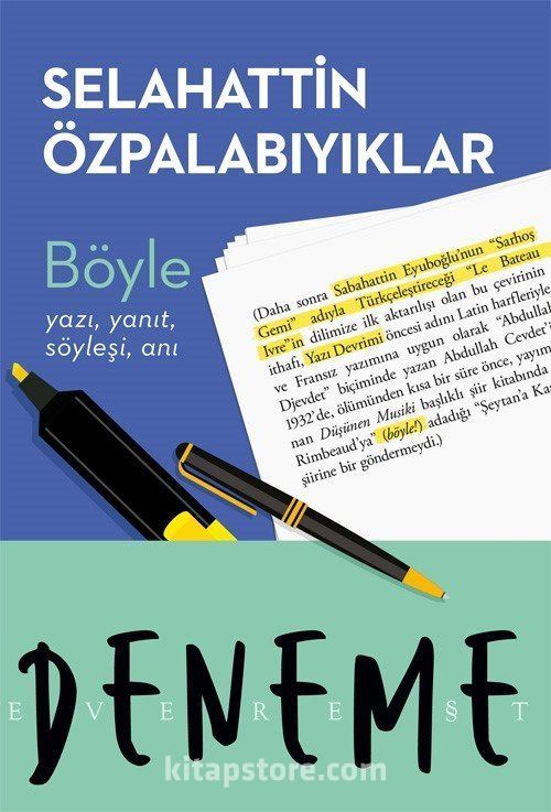 Selahattin Özpalabıyıklar'dan bir yazı, yanıt, söyleşi, anı (ilki için bkz. Göndermeler, ikincisi için bkz. İtalik Benim) kitabı daha! (Everest Deneme dizisindeki üçüncü kitabı olduğunu da eklemeli tabii buraya.) Böyle'de (neden "böyle" olduğunu meraklı okur çözecektir) metiniçi ve metindışı meseleler, öne çıkan tanıtım, sunuş ve arka kapak yazıları, Özpalabıyıklar'la yapılan söyleşiler bir araya geliyor.